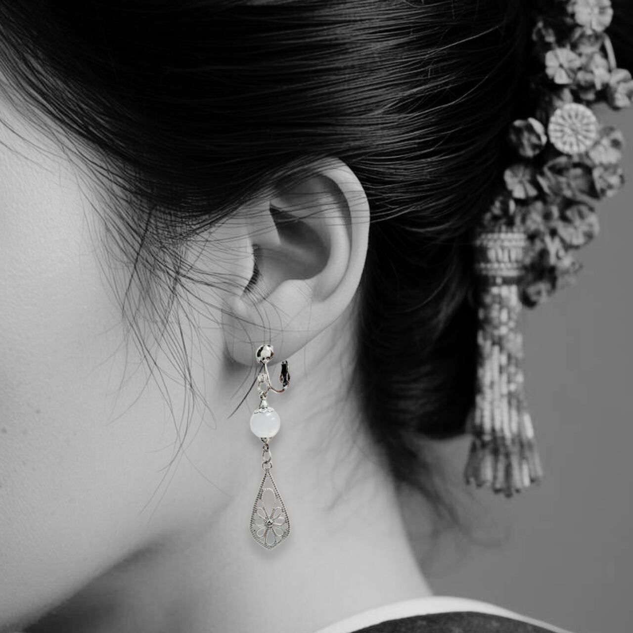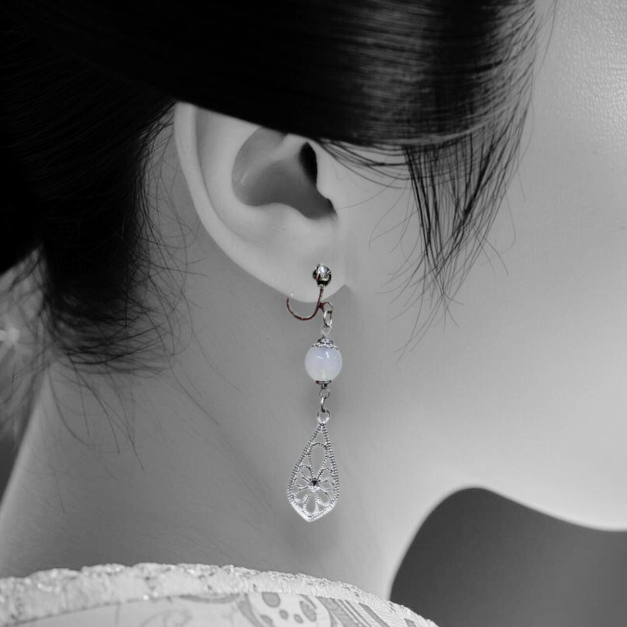 シンプルでありながら、その美しい輝きが魅力的な白メノウ石のイヤリングです。白メノウは浄化や安定を象徴するとされ、多くの人に愛されています。シルバーのチャームの揺れが日常の装いに華やかさを加え、特別なシーンにも輝きを見せてくれます。
