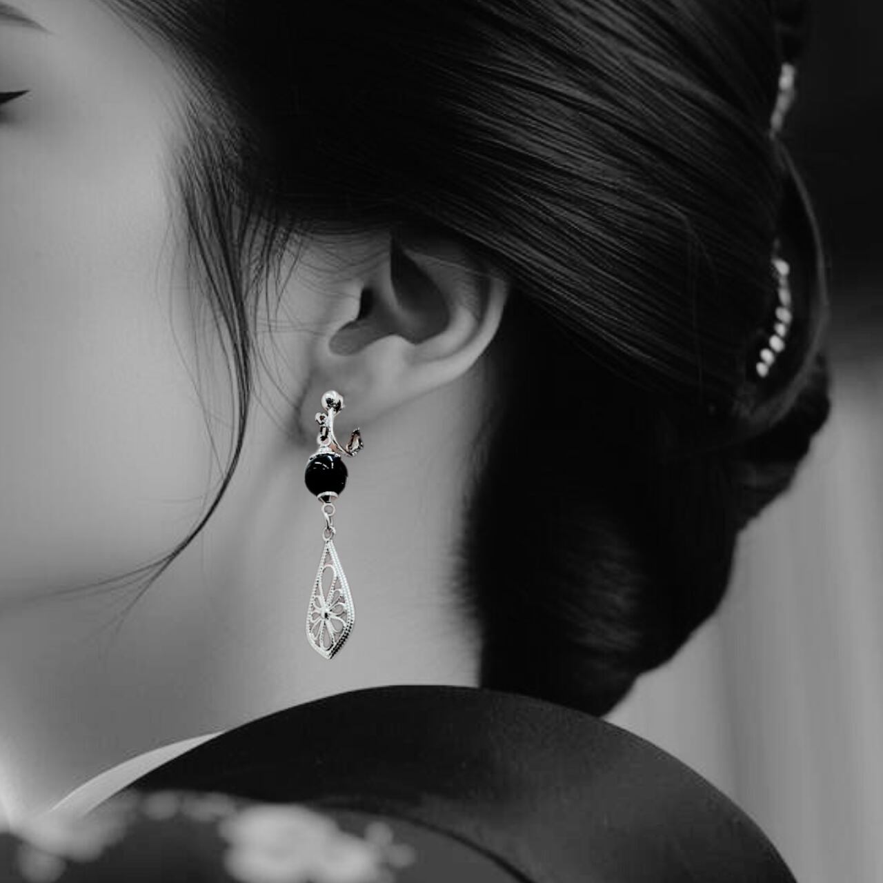 These simple yet captivating black agate earrings showcase their rich black hue that radiates with elegance. Known for symbolizing strong energy and stability, black agate is cherished for its protective qualities. These earrings add a touch of individuality to your everyday outfits, making them an eye-catching accessory for both special occasions and daily wear.