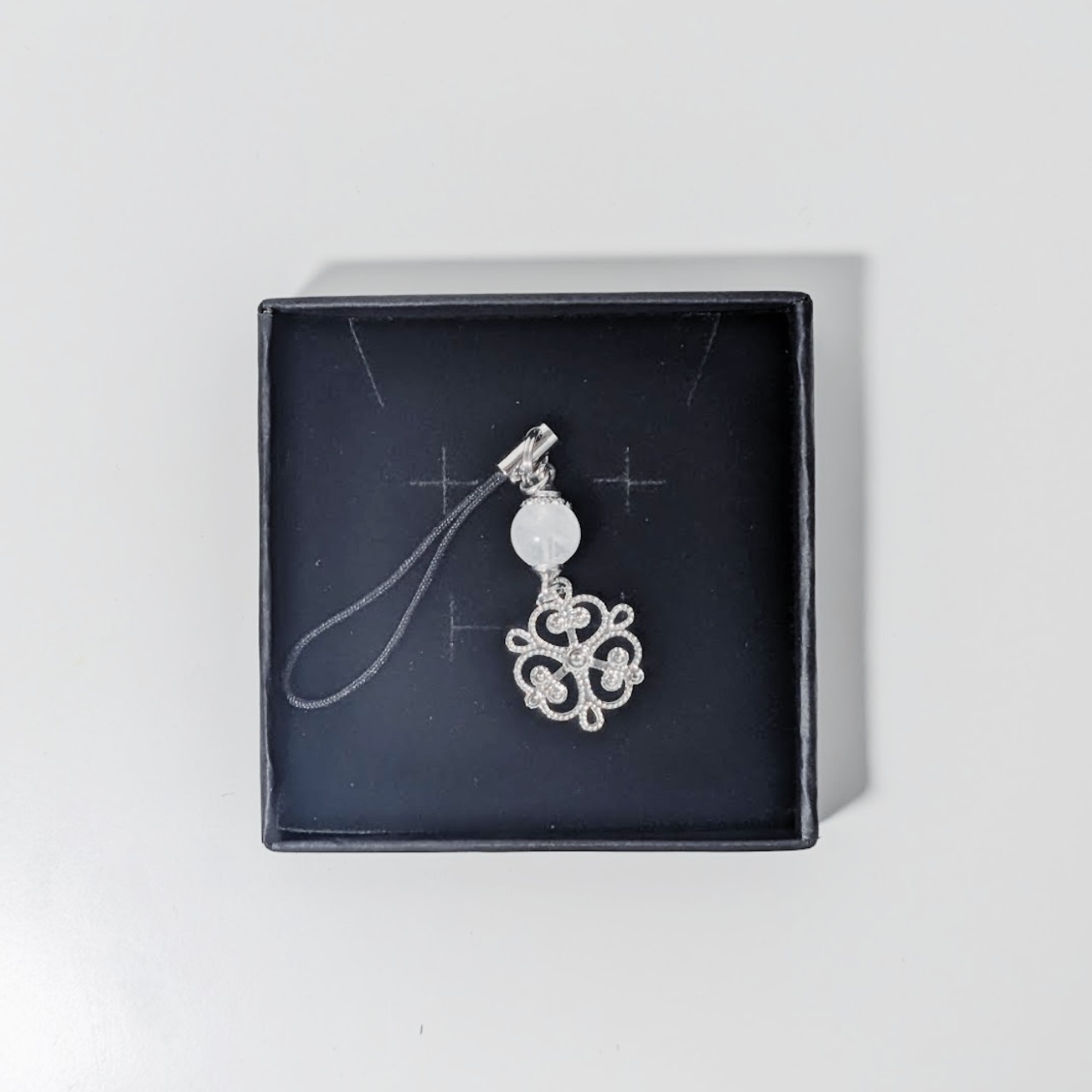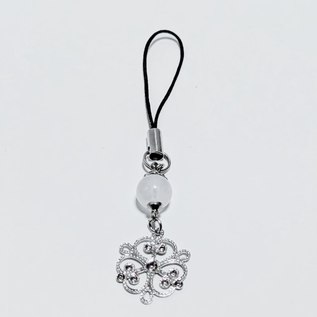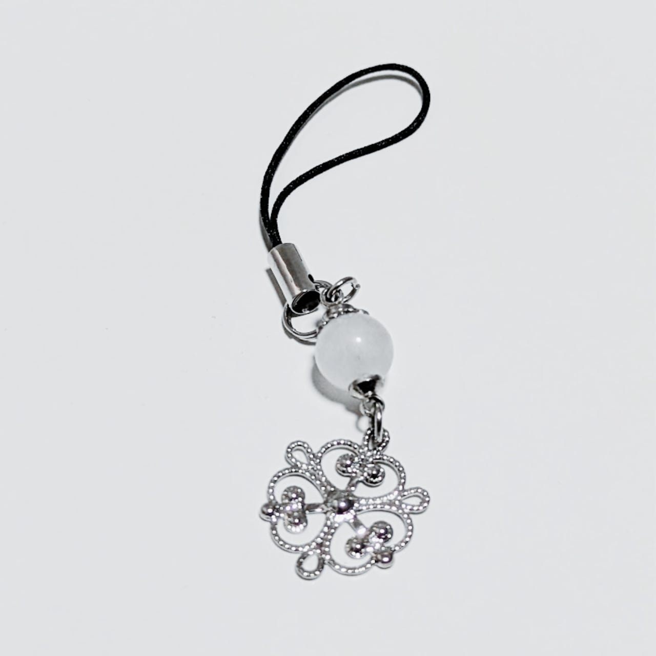 このストラップは、純白の美しさを持つ白メノウ石の8mm玉を使用しています。白メノウは清らかさや心の平和を象徴し、気持ちを落ち着ける力があるとされています。さりげないアクセントぴったりの存在感を持っています。
